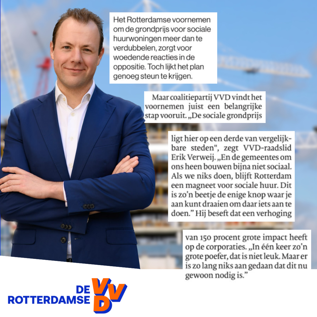 De gemeente Rotterdam rekent een grondprijs die de helft tot wel een derde is van vergelijkbare of omliggende steden. Woningcorporaties zouden gek zijn als ze dan niet eerst naar Rotterdam kijken voor grond om sociale huurwoningen op te bouwen. Maar daardoor is Rotterdam met 53,5% sociale huurwoningen landskampioen sociale woningvoorraad, er is geen andere gemeente in Nederland die een groter aandeel van de woningvoorraad heeft gereserveerd voor de sociale huur. En dat terwijl we een schreeuwend tekort hebben aan huizen in het middensegment. Een stad bestaat uit mensen die financieel bijdragen aan de stad, en mensen die soms ondersteuning nodig hebben. Een stad heeft dragers nodig om vragers te helpen. Als de balans doorslaat naar vragers, dan is het niet mogelijk om alle nodige ondersteuning te bieden. In Rotterdam naderen we dat punt.