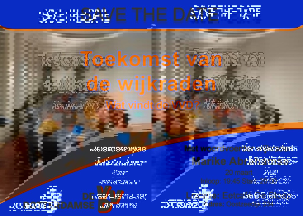 Woensdag 20 maart organiseert raadslid Marike Abrahamse een bijeenkomst over de toekomst van de wijkraden. Zij wil graag met jullie in gesprek om een standpunt te bepalen voor de VVD over het wijkradensysteem. Zijn 39 wijkraden er te veel of te weinig? Zijn de bevoegdheden van de wijkraden toereikend? En werkt de huidige vorm van kieslijsten voor de wijkraden? Kortom, werkt de huidige vorm van wijkraden en wat kan er beter?