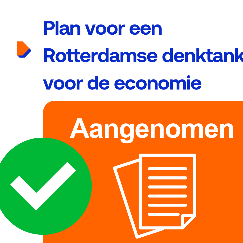 Die keuzes maken kan de gemeente niet alleen. Juist voor deze grote opgave zijn het bedrijfsleven, kennisinstellingen, belangenorganisaties én de overheid nodig. Wij hebben voorgesteld ze samen te brengen in een economische denktank die een antwoord formuleert op twee belangrijke vragen: op welke banen (sectoren) Rotterdam zich de komende jaren gaat richten en hoe we dit proces gaan faciliteren? Dit gaat helpen om Rotterdam ook op nationaal niveau op de agenda te zetten.