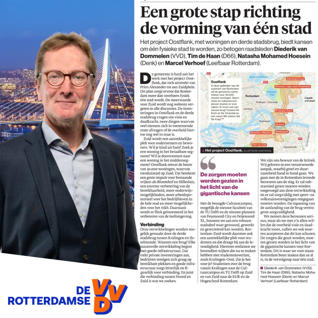 De gemeente is momenteel hard aan het werk met het project Oostflank, een plan dat zich uitstrekt van Prins Alexander tot aan Zuidplein en dat invloed heeft op heel Rotterdam. Dit plan zorgt ervoor dat Rotterdam meer dan voorheen fysiek één stad wordt. De meerwaarde voor Zuid wordt nog wel eens vergeten in alle discussies. De investeringen in Oostflank en de 3e stadsbrug vragen om visie en daadkracht, twee dingen waarvan veel mensen in toenemende mate afvragen of de overheid hiertoe nog wel in staat is.