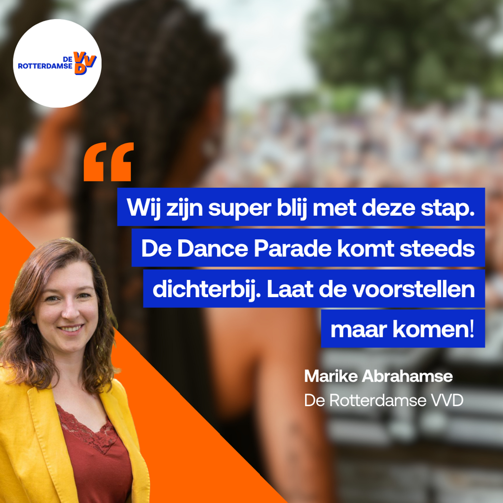“De Rotterdamse VVD begon deze zomer aan een campagne om de Dance Parade terug te brengen naar Rotterdam,” zegt VVD-raadslid Marike Abrahamse. “Het antwoord is er nu: als het veilig kan is de stad er klaar voor. Nu zijn de festivalorganisatoren aan zet, dus kom maar op met jullie plannen!”